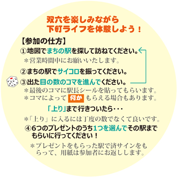 終了 あらかわ まちの駅下町双六 2024 2024年5月18日〜8月17日 2024年も「双六」vol.3を開催。参加者が振るサイコロの目の数によって、進み具合が違います。双六をしながら下町を体験できるまちの駅巡りイベント。コマによっては景品がありますし、「上り」でも選べるプレゼント進呈。「バラの市盛り上げ隊」にも参加しました。 主催:あらかわ区まちの駅ネットワーク 後援:荒川区 主催 あらかわ区まちの駅ネットワーク 後援 荒川区 イベント資料