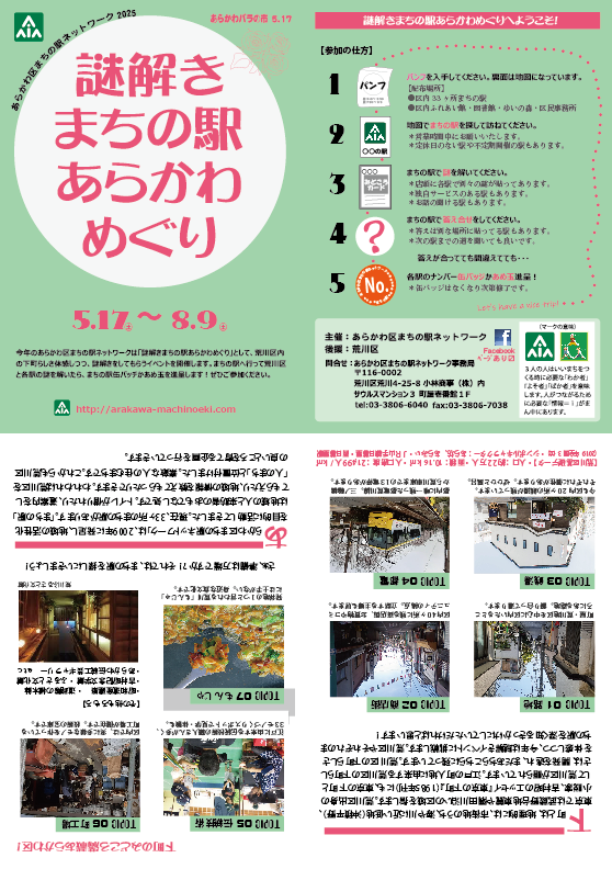 終了 謎解きまちの駅あらかわめぐり 2025年5月17日〜8月9日 荒川区内の下町らしさを体感しつつ、謎解きをしてもらうイベント。まちの駅へ行って荒川区と各駅の謎を解いたら、まちの駅缶バッチかあめ玉を進呈。 主催 あらかわ区まちの駅ネットワーク 後援 荒川区 イベント資料
